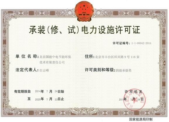 7月24日,經(jīng)國家能源局華北監(jiān)管局批準,北京國能中電節(jié)能環(huán)保技術(shù)有限責任公司獲得電力設(shè)施承修類資質(zhì)(四級),許可證有效期6年。國能中電會不斷開拓電力承修方面的業(yè)務,為客戶提供更優(yōu)質(zhì)的服務。