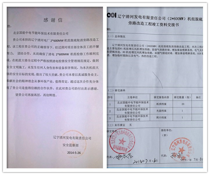 在公司總部的正確領導下,經(jīng)過清河EPC旁路改造項目部全體成員的共同努力,7月18日,遼寧清河發(fā)電有限責任公司業(yè)主代表在竣工資料交接證書上簽字,標志著我公司承擔的遼寧清河電廠2*600MW機組脫硫取消旁路改造工程正式竣工驗收,成功打響了我司在中國電力投資集團的第一槍。