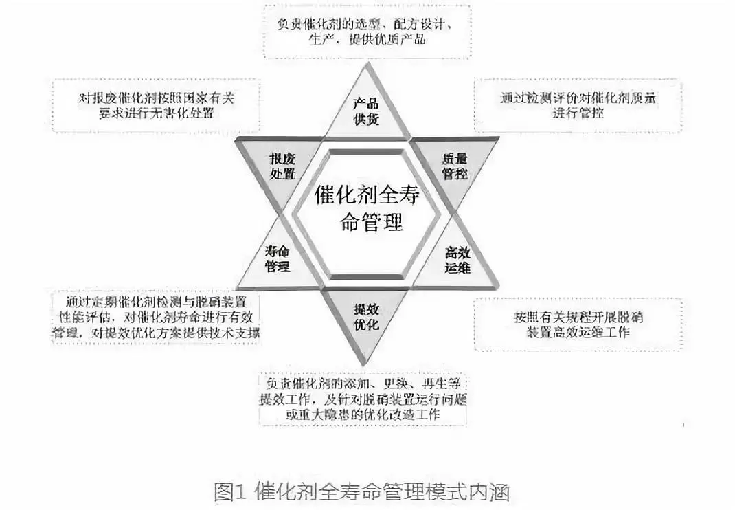 針對(duì)當(dāng)前SCR脫硝催化劑應(yīng)用現(xiàn)狀及存在問(wèn)題,催化劑全壽命管理不僅應(yīng)確保催化劑采購(gòu)成本的集約化,還應(yīng)包括對(duì)脫硝裝置的高效性能管控,在此基礎(chǔ)上實(shí)現(xiàn)脫硝裝置的可靠、高效、經(jīng)濟(jì)運(yùn)行,因此催化劑全壽命管理模式應(yīng)涵蓋催化劑全壽命周期的產(chǎn)品供貨、質(zhì)量管控、高效運(yùn)維、提效優(yōu)化、壽命管理以及報(bào)廢處置六個(gè)部分。同時(shí)催化劑全壽命管理不僅以發(fā)電企業(yè)為主體單位,還應(yīng)包括催化劑廠商與第三方技術(shù)服務(wù)單位作為責(zé)任單位,通過(guò)明確各方責(zé)任,充分發(fā)揮各方專業(yè)特長(zhǎng),發(fā)電企業(yè)能夠獲得質(zhì)量穩(wěn)定可靠的催化劑產(chǎn)品與優(yōu)質(zhì)高效的技術(shù)服務(wù),減少催化劑采購(gòu)成本與運(yùn)維成本,實(shí)現(xiàn)催化劑全壽命管理的效益最大化。