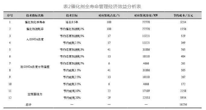 以某1000MW機(jī)組為例,假設(shè)能夠?qū)⒋呋瘎┗瘜W(xué)壽命由3年延長(zhǎng)至3.5年、節(jié)約還原劑耗量5%、降低脫硝及空預(yù)器運(yùn)行阻力300Pa,則可年節(jié)約催化劑成本50萬(wàn)元、還原劑成本40萬(wàn)元、能耗(水、電、汽耗)成本160萬(wàn)元,總計(jì)可節(jié)約脫硝運(yùn)行成本250萬(wàn)元/年。假設(shè)國(guó)內(nèi)某發(fā)電集團(tuán)192臺(tái)77770MW SCR脫硝機(jī)組催化劑統(tǒng)一實(shí)施全壽命管理模式后,基于當(dāng)前運(yùn)行現(xiàn)狀,通過(guò)折算對(duì)應(yīng)裝機(jī)的催化劑采購(gòu)成本、還原劑消耗成本、能耗成本,如表2所示,可節(jié)約脫硝運(yùn)行費(fèi)用約1.63億元/年。因此全壽命管理模式實(shí)施后,將能夠有效提升脫硝裝置運(yùn)行可靠性、減少脫硝裝置運(yùn)行成本。